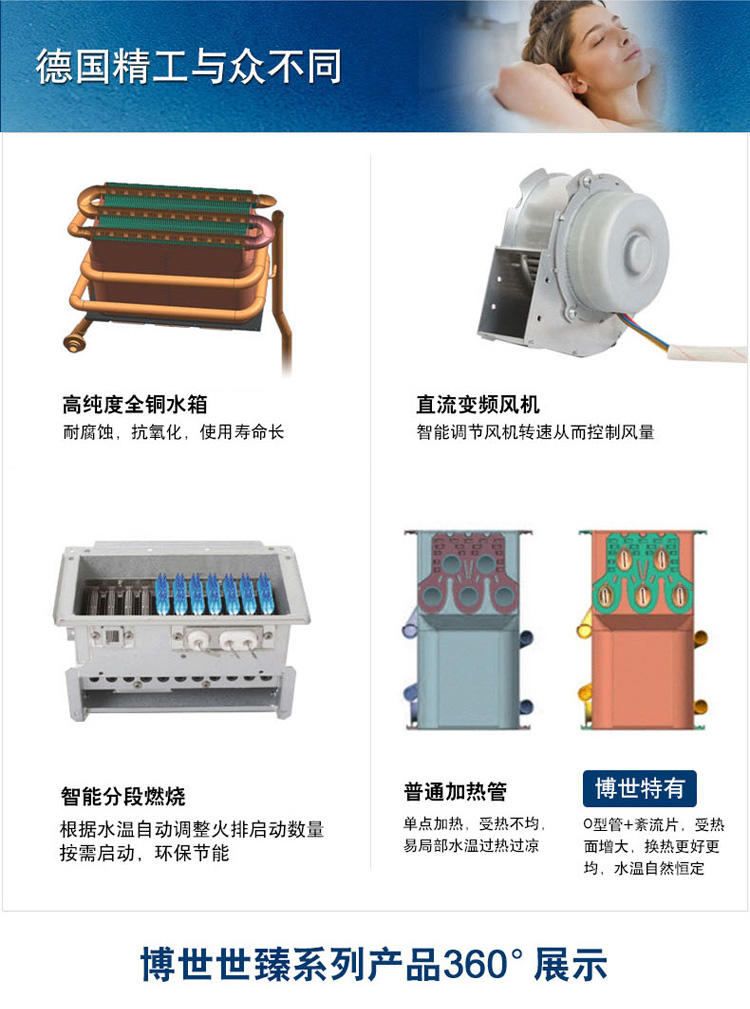 智能恒溫控制系統,超寬頻水量調節。通過搭載伺服電機,根據設定溫度連續調節水量,舒適節能到極致。一氧化碳探測報警器,細心呵護您的安全。更有多點控制,可連接兩個遠程遙控器, 控制更方便快捷。
