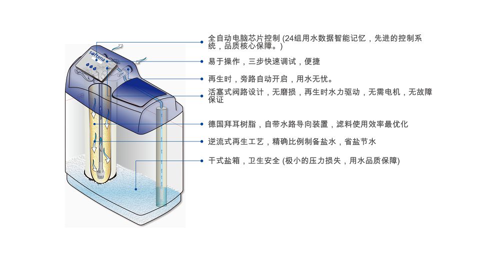 e、濾料品質頂級、軟化效果的保障,國際先進的濾料選擇,樹脂采用德國拜耳樹脂,軟水品質的保證。