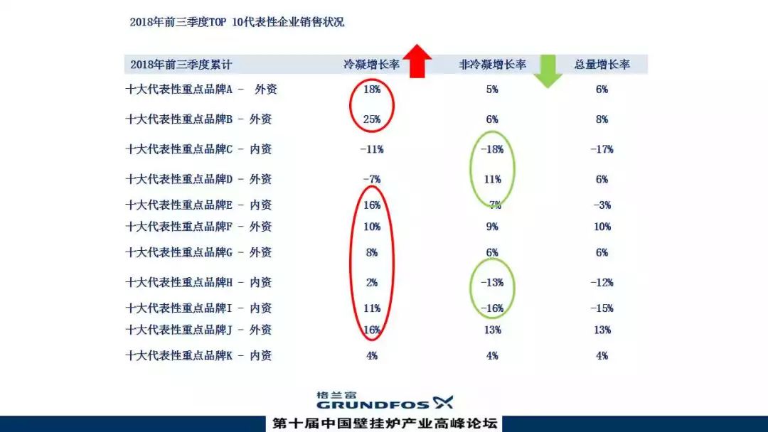 紅色是2018年整個壁掛爐,包含“煤改氣”產(chǎn)品的銷量,基本在350~400萬臺。前三季度銷量前十的企業(yè)本來我是想把品牌名列出來的,但佰世越?jīng)]有所有權(quán),所有權(quán)歸我們客戶。客戶建議把外資、內(nèi)資列出來,可以參考。